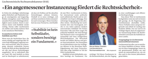 Diese klare Aussage trifft Präsident Dr. Manuel Walser auf die Frage zur Stabilität in unsicheren Zeiten. Die Zeitung «Wirtschaft regional» wollte von den Verbänden in Liechtenstein wissen, wie man mit der aktuell vorherrschenden Unsicherheit umgehen soll. Die Antwort von Dr. Manuel Walser ist klar: Stabilität benötigt Rechtssicherheit: